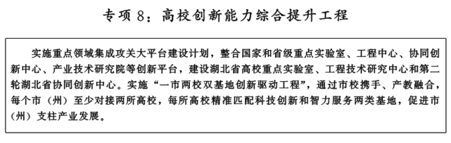 1.激发高校科技创新潜能。充分发挥高校区域创新体系建设排头兵、增强发展新动能策源地作用,着力提升原始创新和应用技术创新能力。支持高校积极参与创建武汉国家科技创新中心、湖北东湖综合性国家科学中心和湖北实验室建设。强化产学研协同创新,围绕“光芯屏端网”、生物制药、新能源和智能汽车、航空航天、电子信息、网络安全、装备制造、冶金化工、先进材料、现代农业、现代物流等,攻克一批“卡脖子”技术,推动“临门一脚”关键技术产业化。深化高校科技体制改革,建立以质量、绩效、贡献为导向的高校科技人才评价体系,构建充分体现知识、技术等创新要素价值的收益分配机制,完善科研人员职务发明成果权益分享机制。创新科技成果转化机制,支持高校科研人才按规定离岗创业、兼职创新、在职创办企业、到企业工作或参与项目合作,开辟“湖北技术交易大市场”高校专场,加快高校科技成果就地在鄂转化,增强“钱变纸”“纸变钱”的能力。推进高校科技创新军民融合发展。